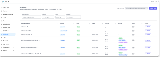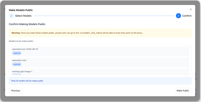 Go to the public url (PROXY_BASE_URL/ui/model_hub_table) and see available models.