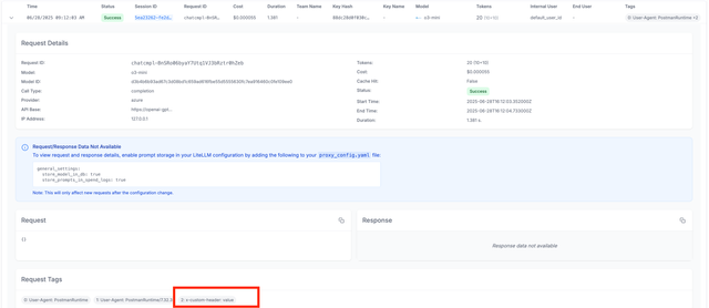 After making requests, navigate to the Logs section in the LiteLLM UI to view Model, Usage and Cost information.